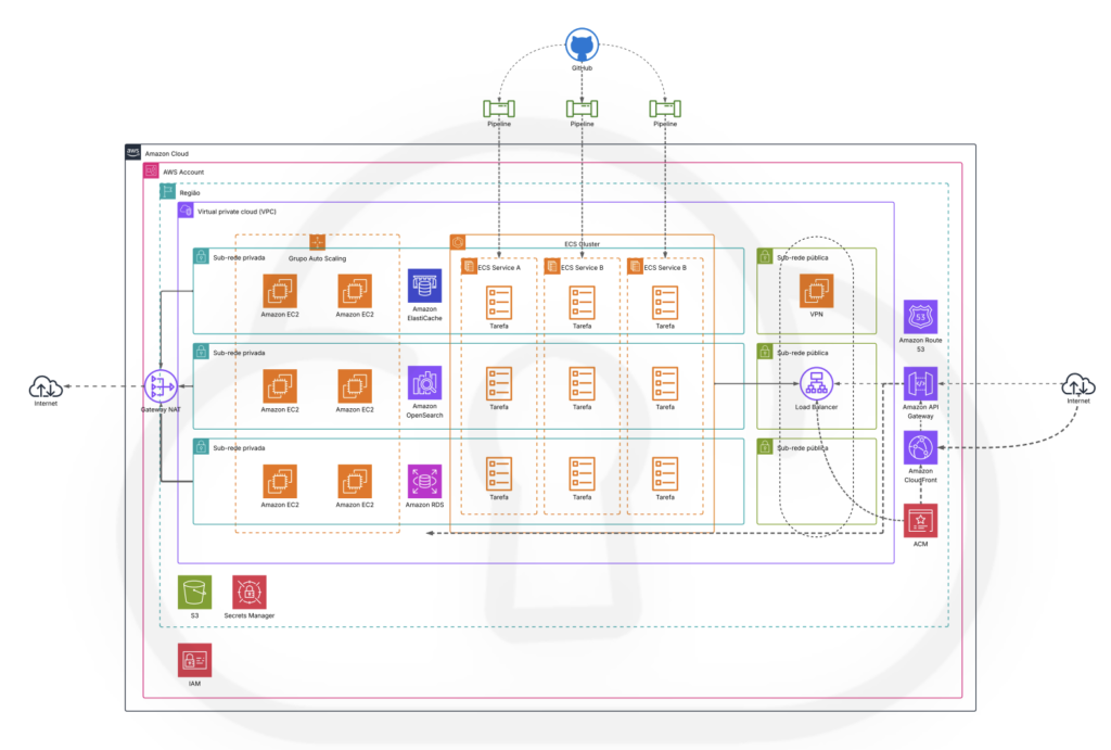 Para profissionalizar o ciclo de desenvolvimento, a Mytech implementou Infraestrutura como Código (IaC), criando pipelines de CI/CD automatizados e segregando a estrutura em múltiplas contas e ambientes (Desenvolvimento, Homologação e Produção). Isso garantiu que novas funcionalidades pudessem ser testadas e validadas sem risco de impactar o cliente final.